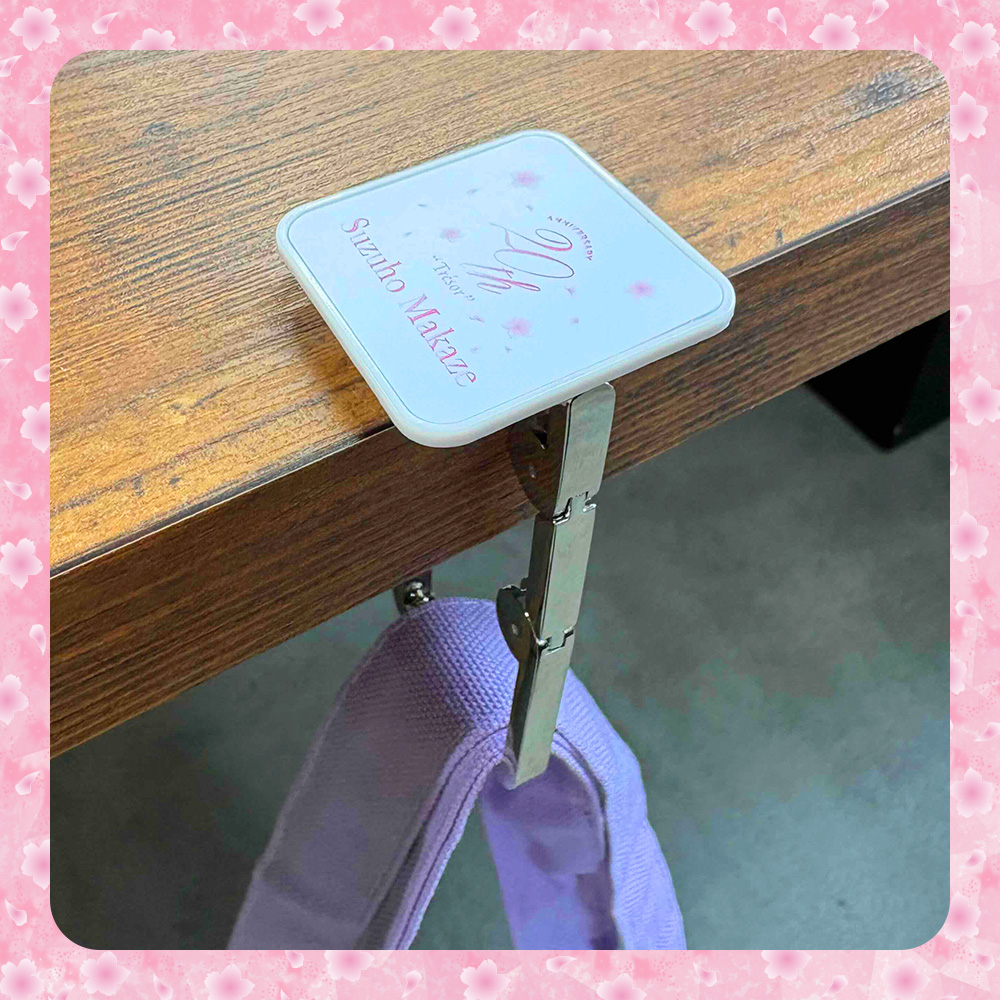 テーブルの縁に取り付けるだけで、バッグハンガーに早変わりするキーホルダー。